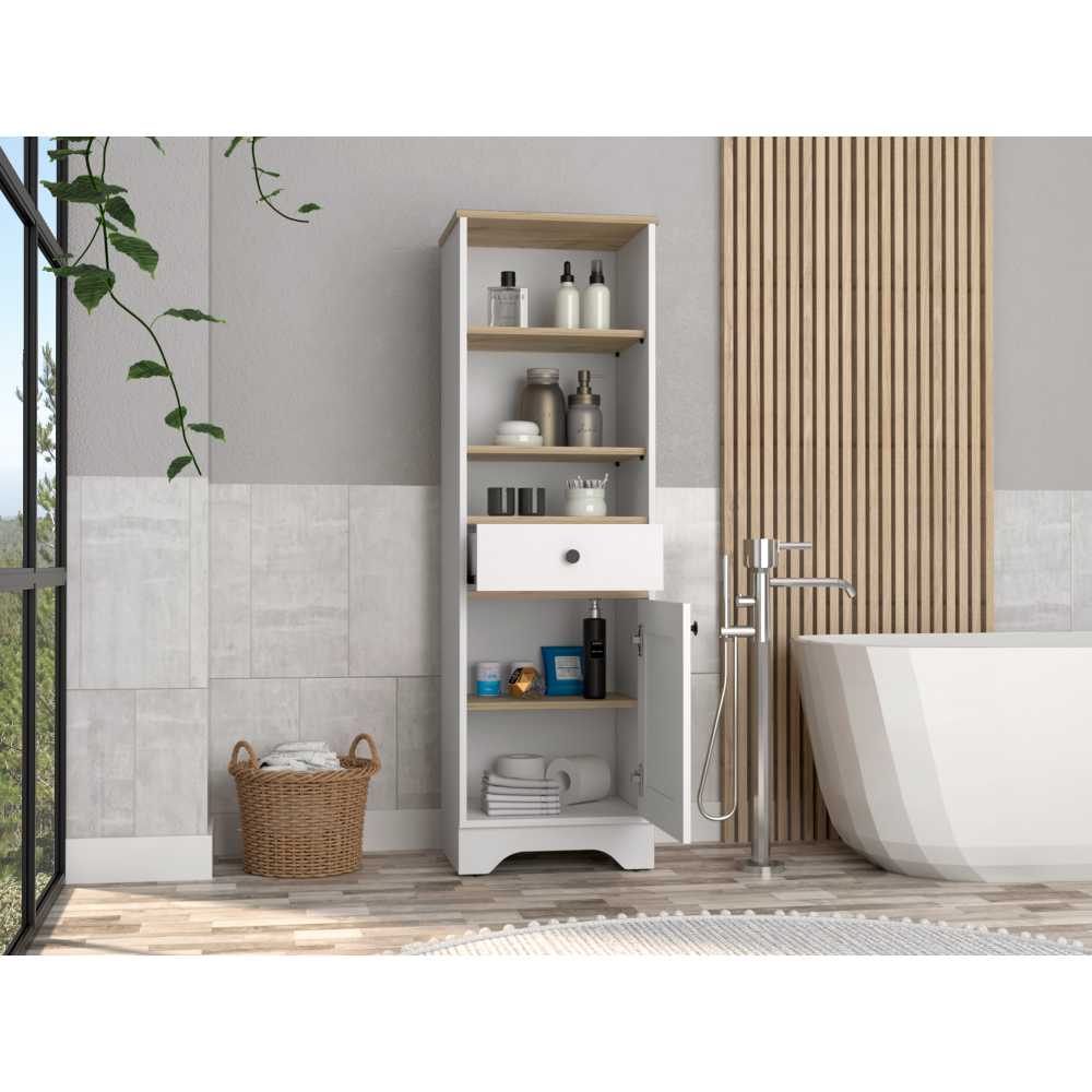 Gabinete de baño con una puerta abatible y un cajon, compartimentos para ubicar articulos de baño y objetos personales, de facil instalacion
