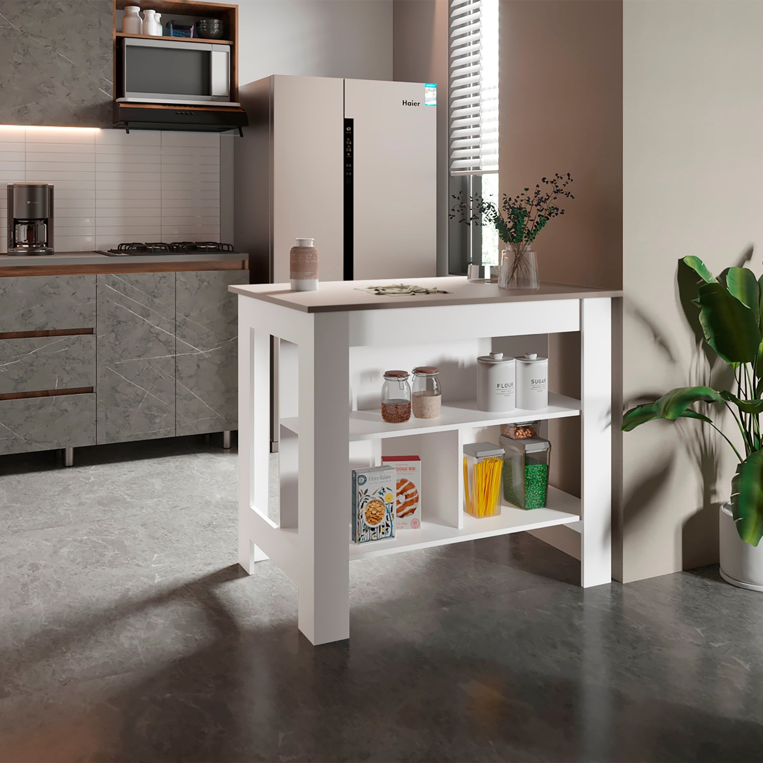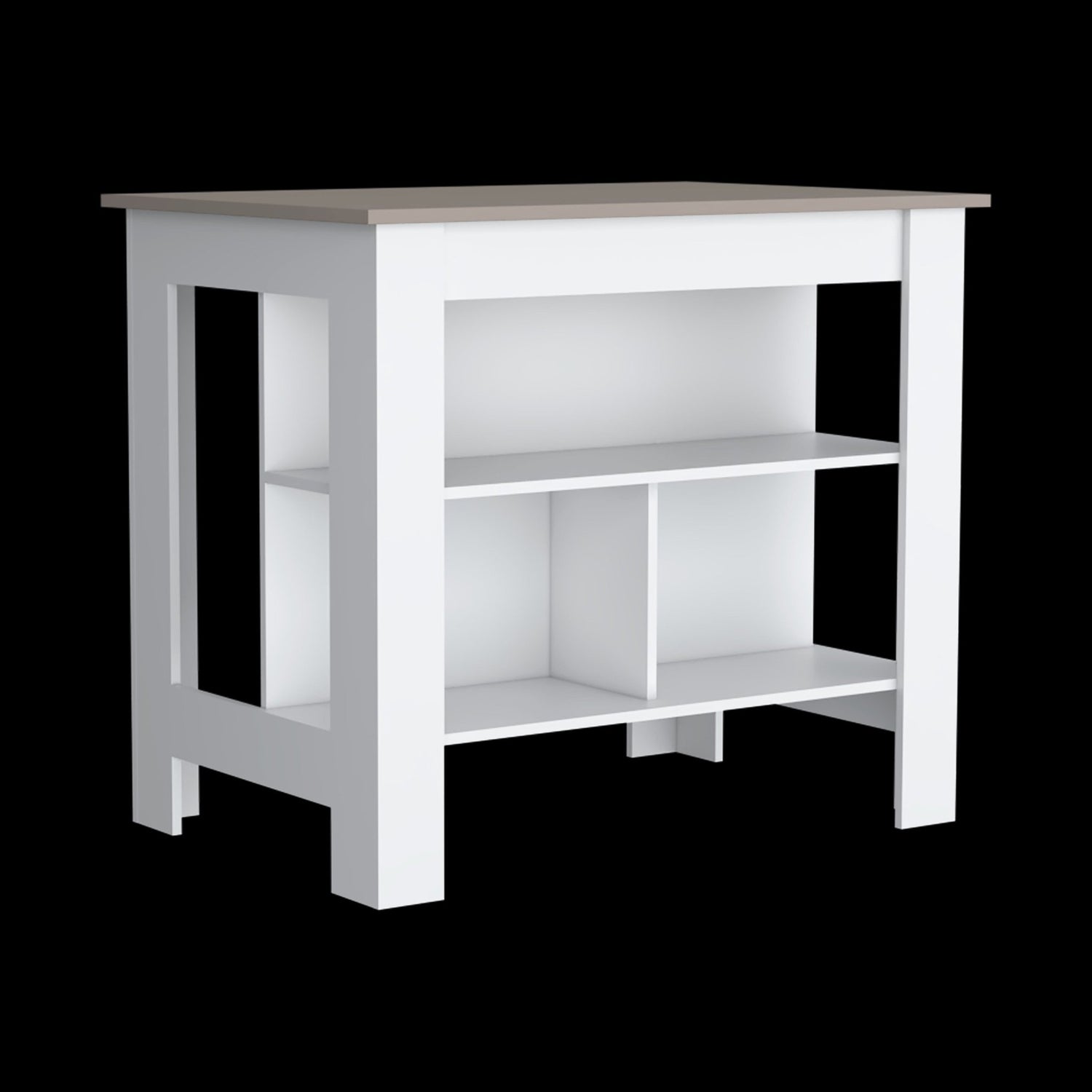 Isla de Cocina Cala Taupe y Blanco 103x90cm Con Tres Entrepaños y Patas
