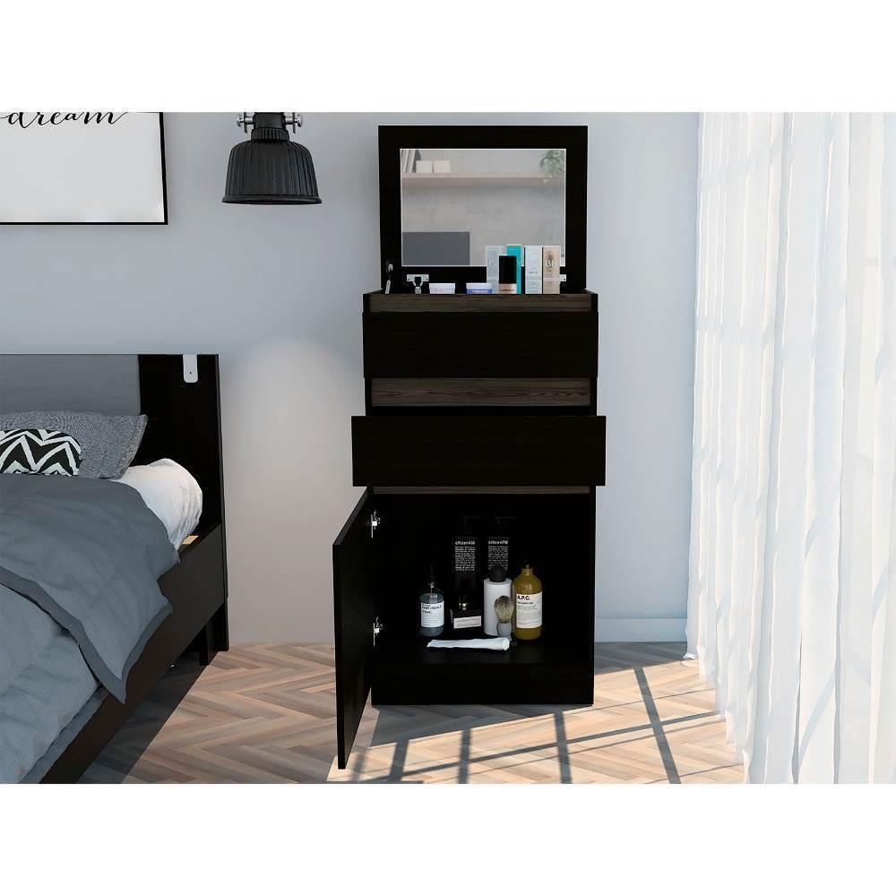 Este mueble es perfecto para almacenar tus objetos de valor, como joyas, relojes, accesorios. Para esto, cuenta con dos compartimientos deslizables y un gabinete con puerta. Tiene un diseño que inspira exclusividad y elegancia que puedes ubicar en tu habitación y complementarlo con algún espejo (nosotros manejamos muchos que pueden gustarte) o cualquier otro elemento decorativo