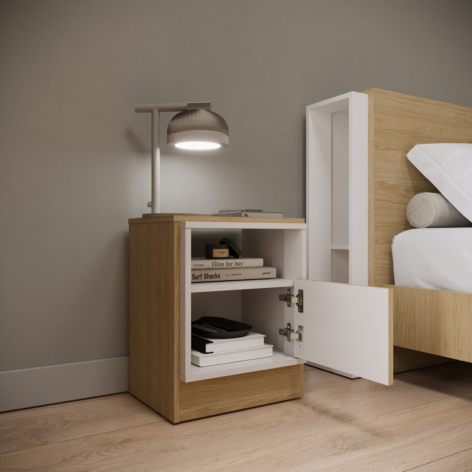 • Diseño moderno en color rovere y blanco.