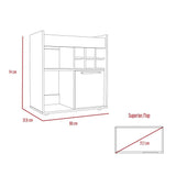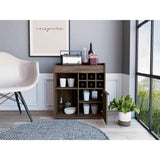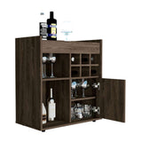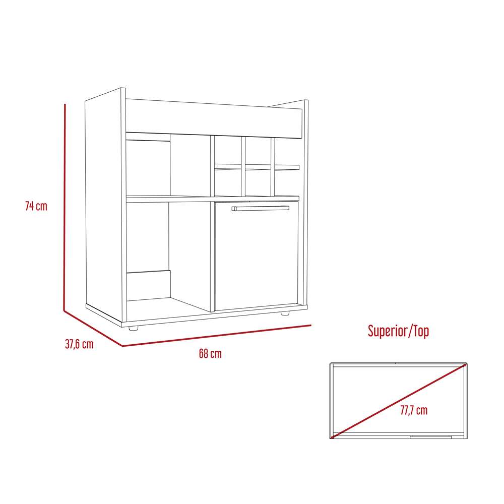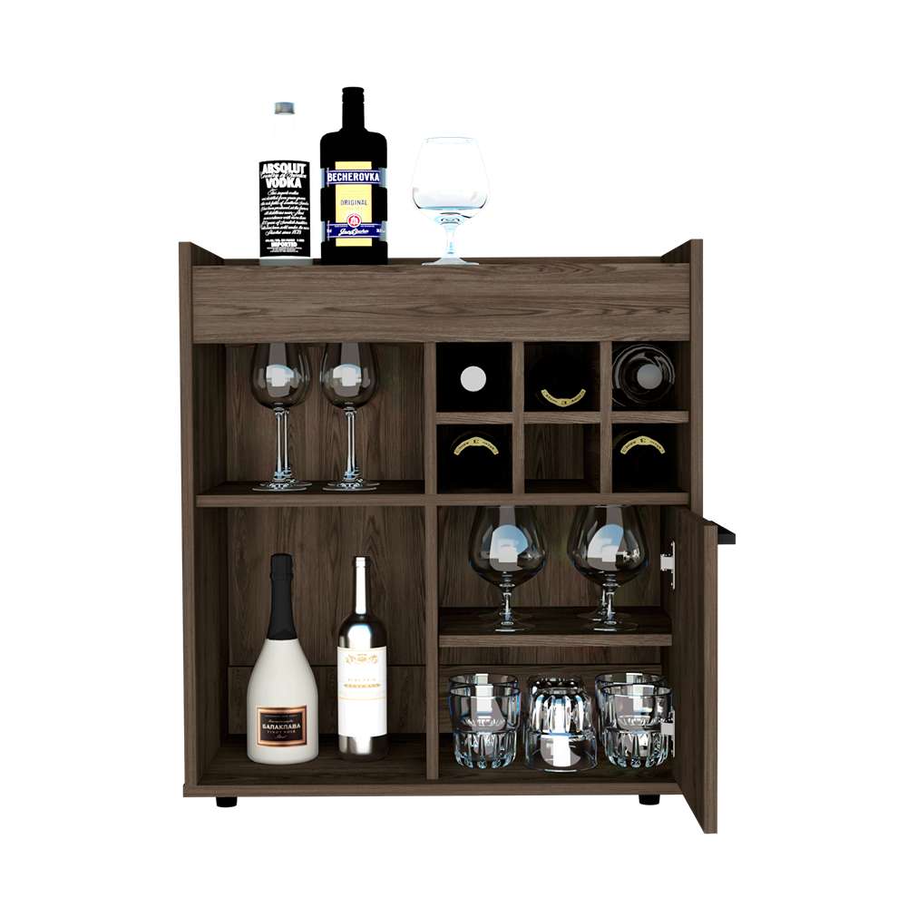 Mueble bar con rack para botellas de vino, espacios para colocar objetos decorativos copas y licores, una puertas abatibles