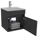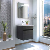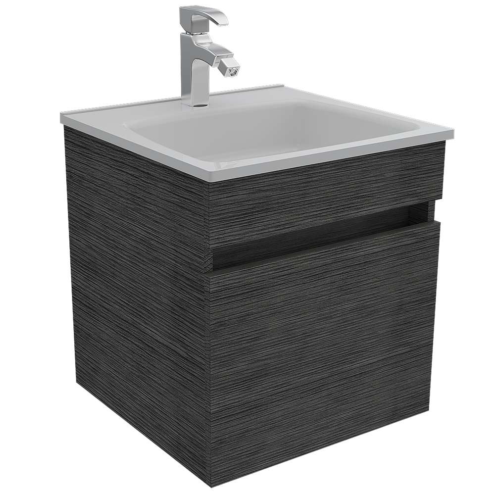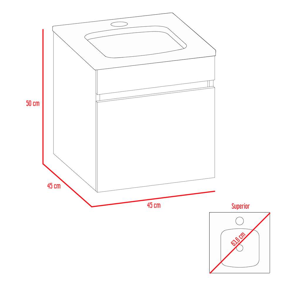 Mueble con diseño moderno, una puerta abatible con apertura sin manija, espacio para objetos y entrepaño interno, incluye lavamanos, no incluye espejo ni griferia