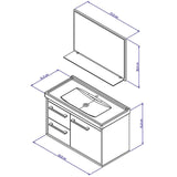 Incluye: - Un (1) espejo - Un (1) lavamanos en BMC - Una (1) puerta - Dos (2) cajones - Una (1) repisa en vidrio - Bisagras metálicas - Manija en ABS metalizado - Kit de herrajes - Manual de armado
