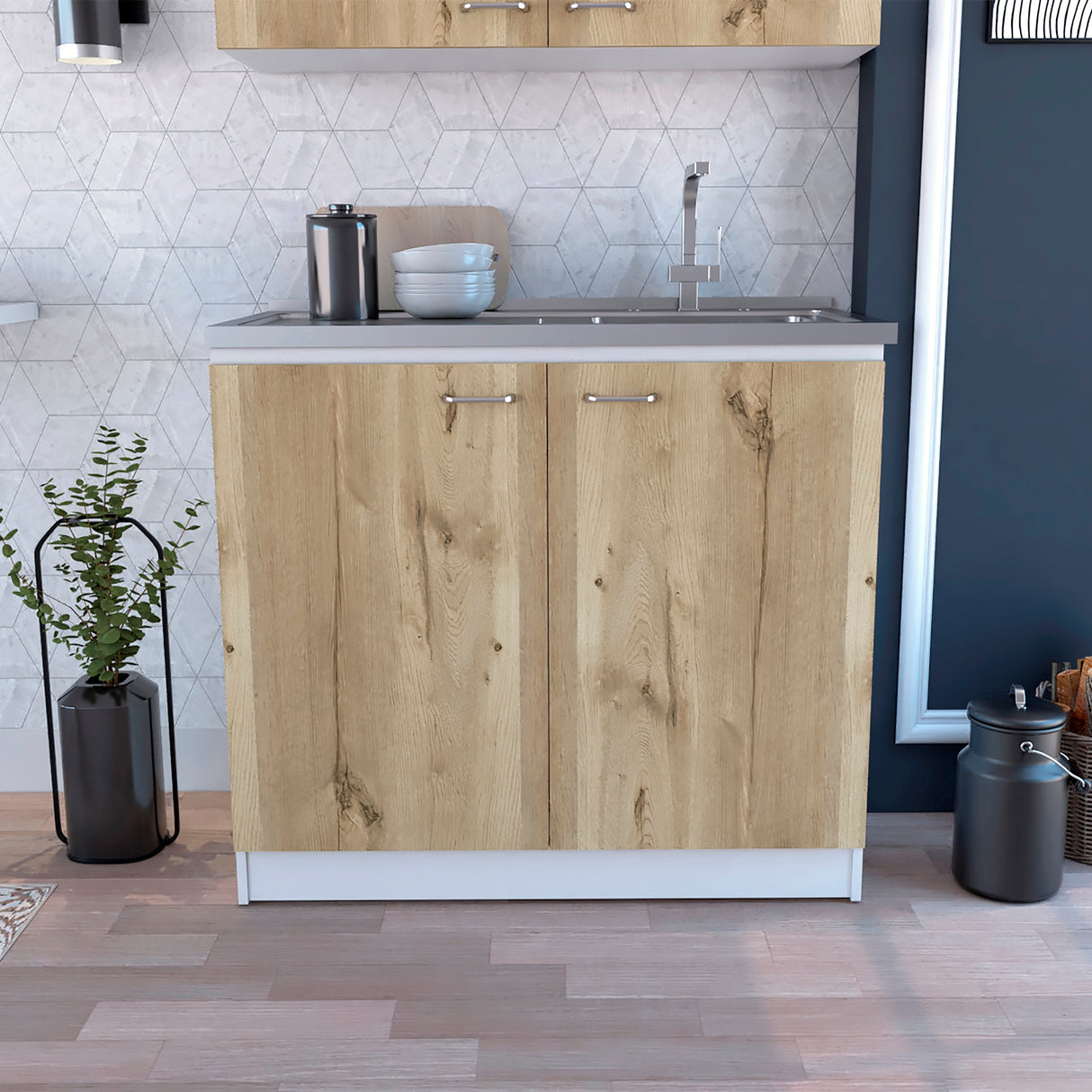 Mueble Inferior de Cocina Napoles Blanco y Duna 100x90cm Con Mesón de Acero Inoxidable para Lado Izquierdo y sin Estufa