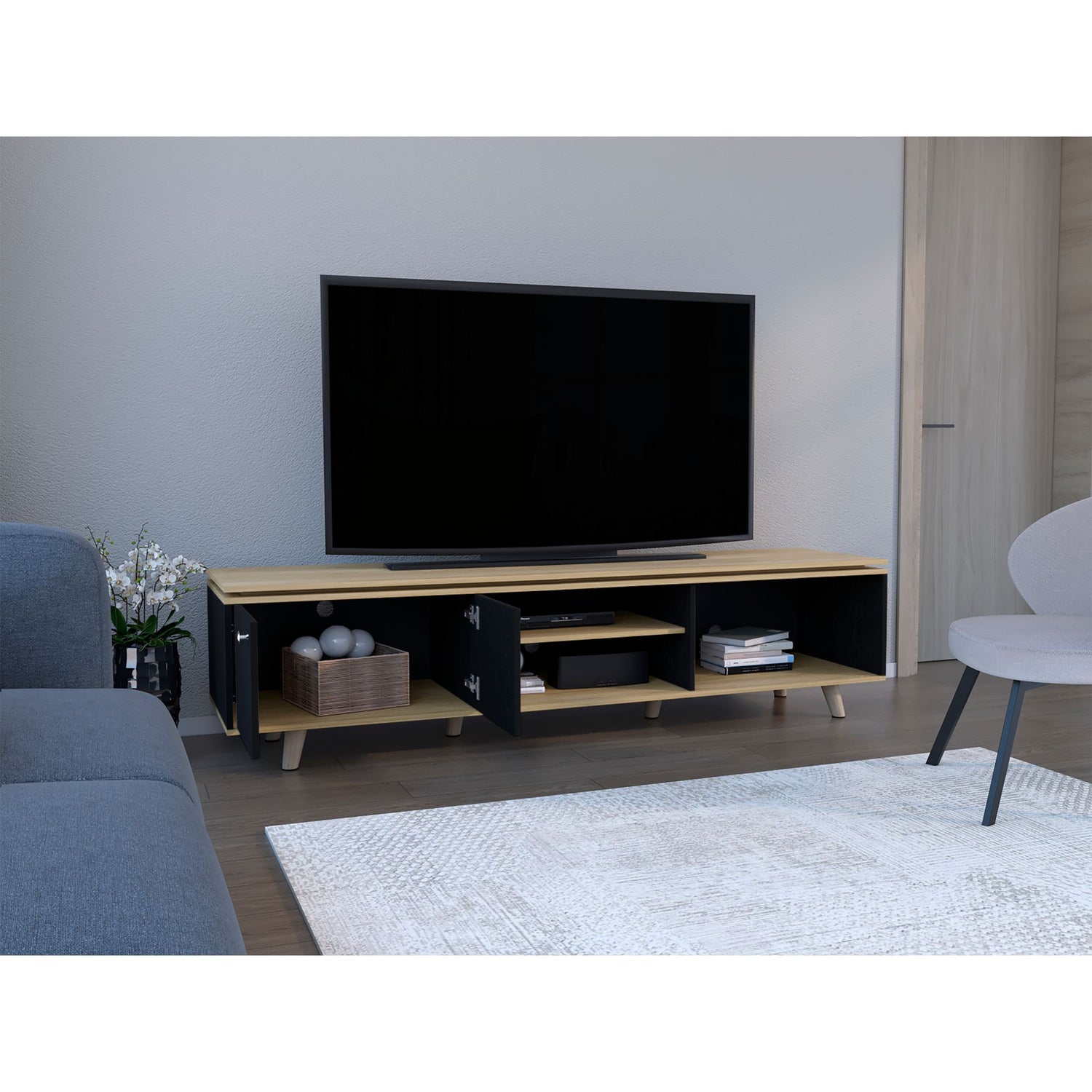 Rack de TV Rochester Negro y Fresno Europeo 200x50cm para TV Hasta 75" Pulgadas con Cuatro Compartimientos
