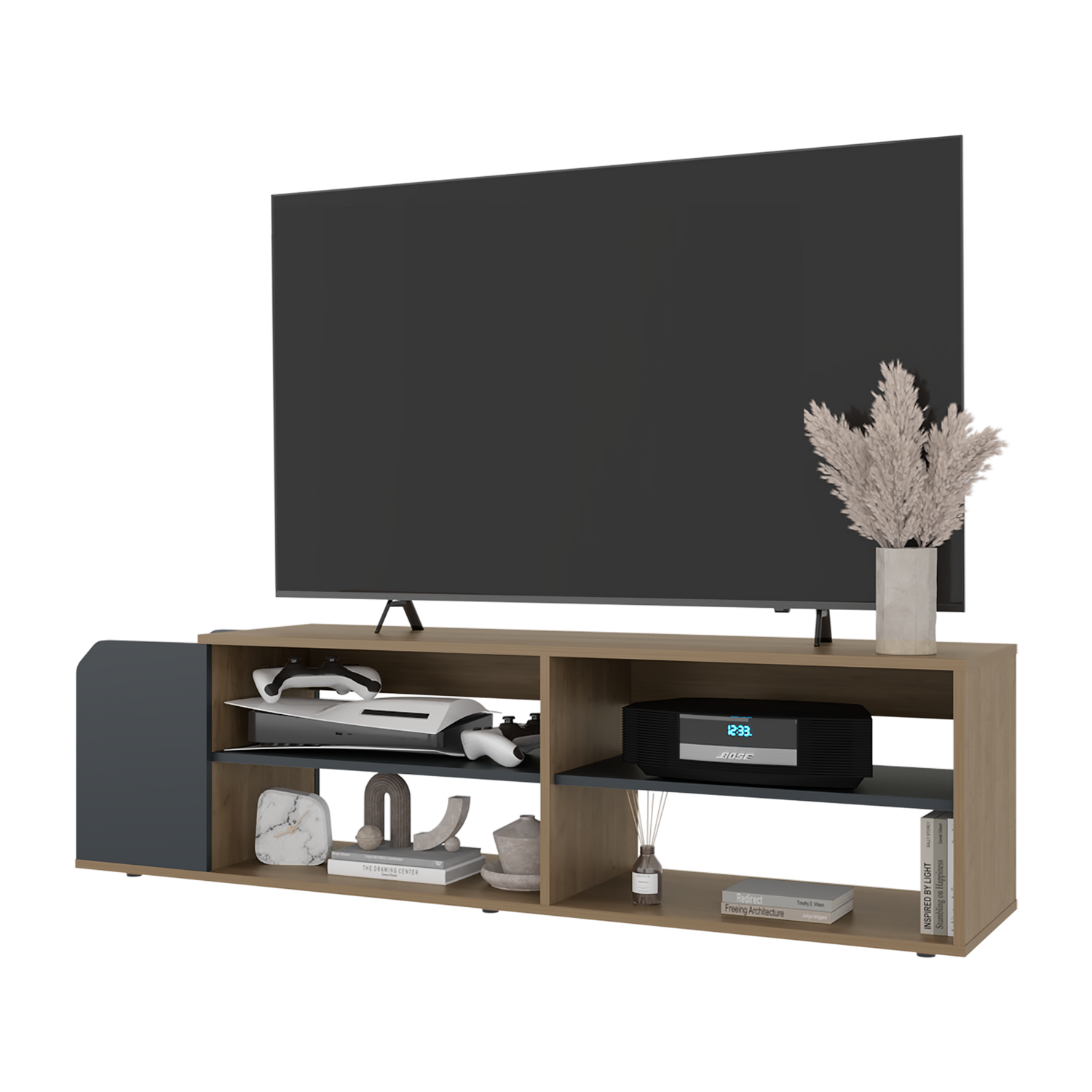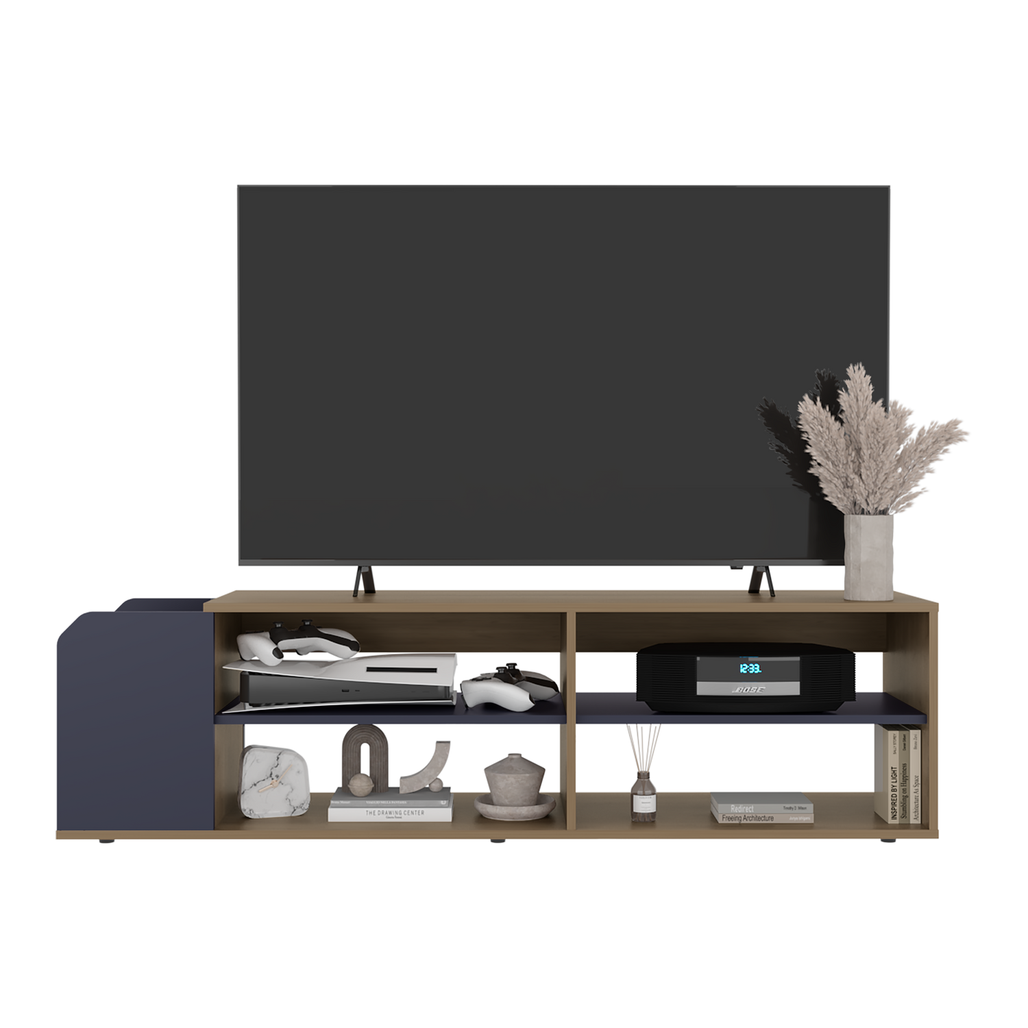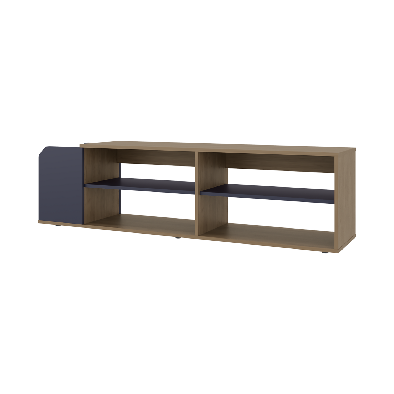 Rack de TV Solene Fresno Europeo y Azul 150x42cm para TV Hasta 60" Pulgadas Con Cuatro Compartimientos y Ranuras para Cable